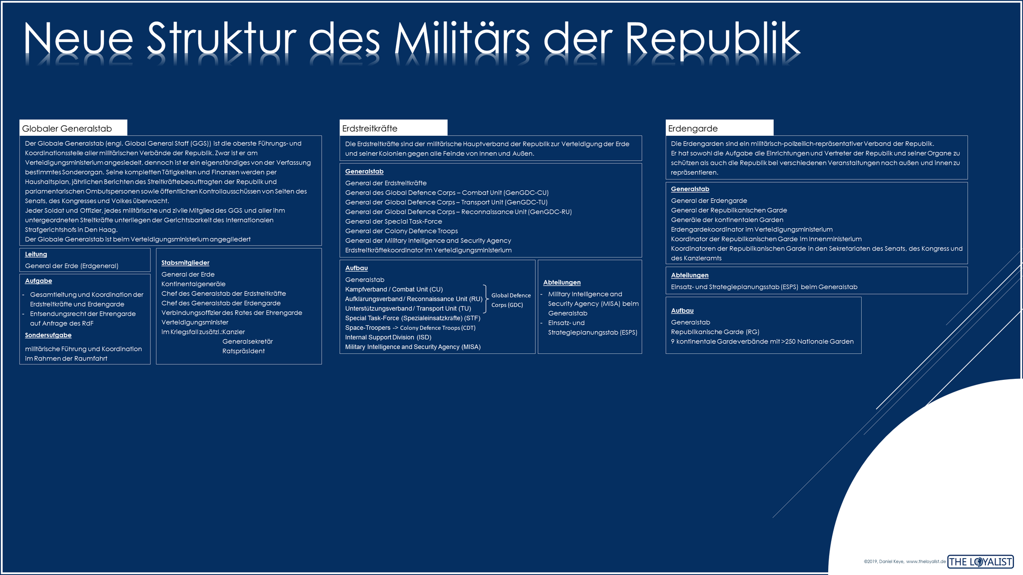 Die Streitkräftereform 3.0 fußt auf den Erfahrungen des III. Weltkriegs in welcher die Kombination der einzelnen Verbände eine entscheidende Rolle beim Sieg über die Separatisten hatte.